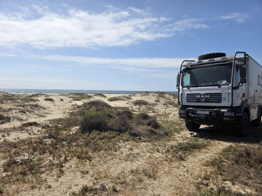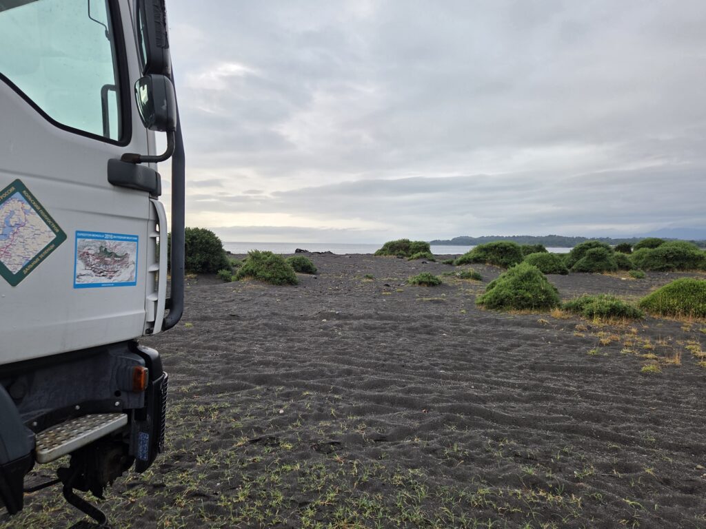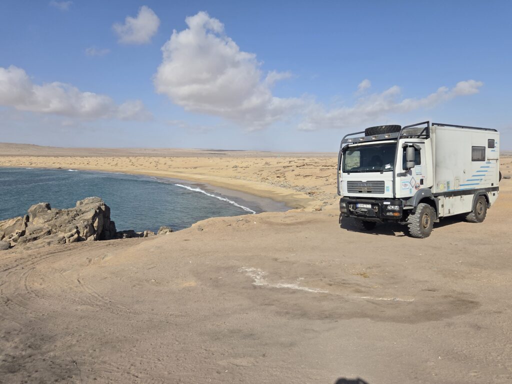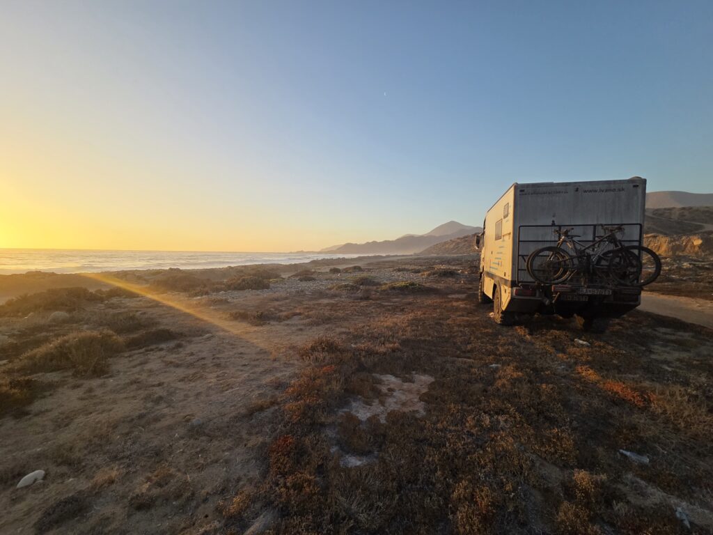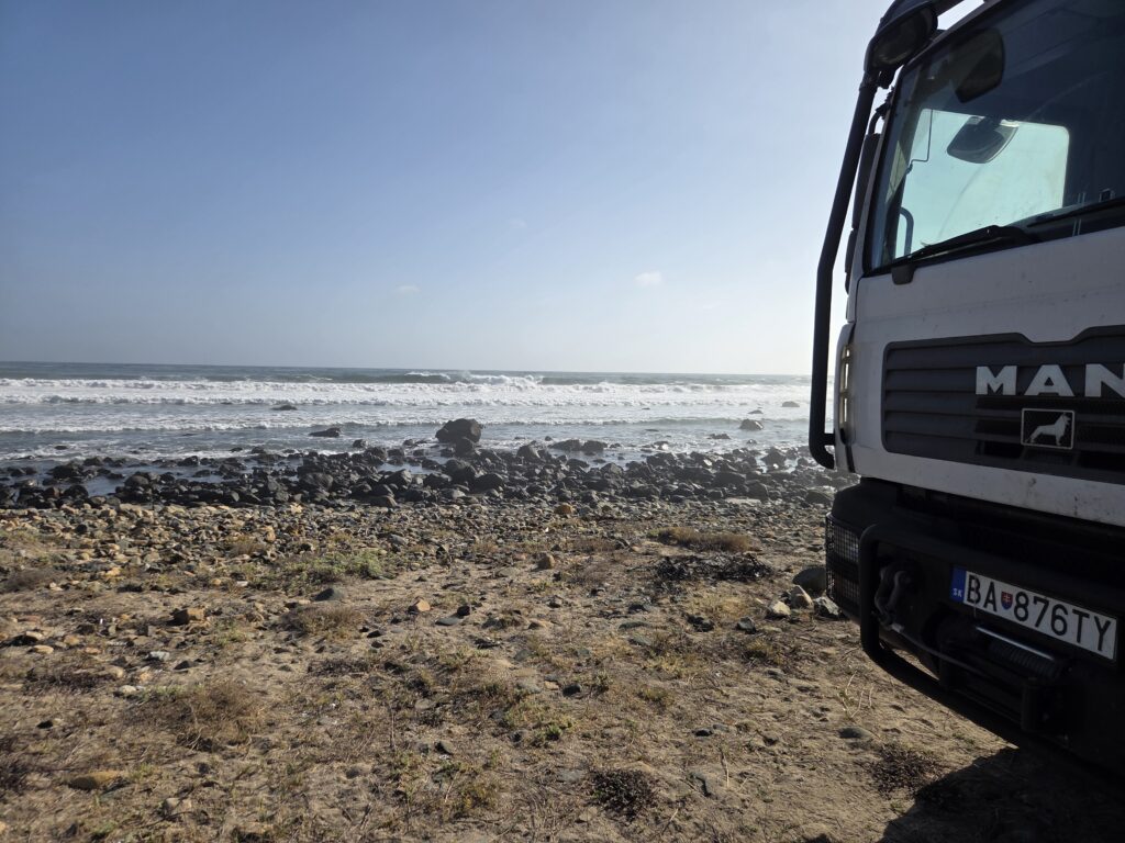 Dnes 30.12.25 cesta opäť na juh /ako inak/:-) Samozrejme západný vietor, a teda miestami ozaj sila, hlavne nárazy, ktoré mykali búdku a tak max 60km/hod a to stále korigovanie volantom a k tomu vyjazdené koľaje. Bol to dosť záhul, teda pre šoféra :-). 300 km 60kou a neustále vyrovnávanie volantom dalo zabrať. Ale zase, vďaka iOverlander nádherné chránené miesto pred vetrom na brehu oceánu, tak to bola odmena :-).