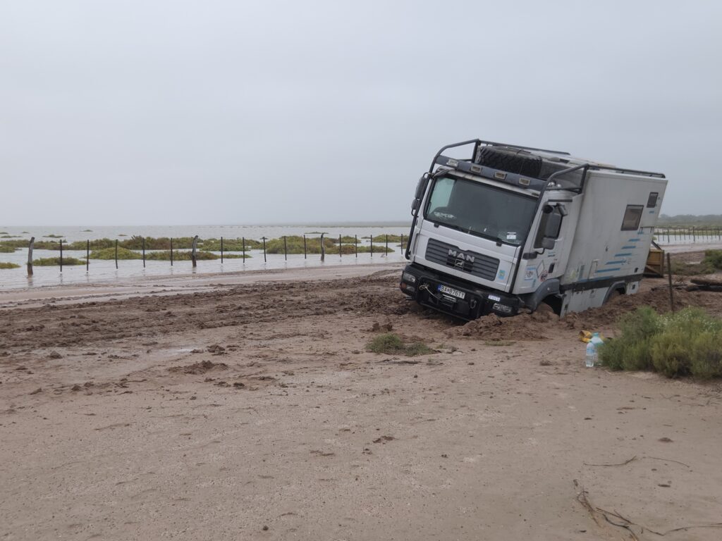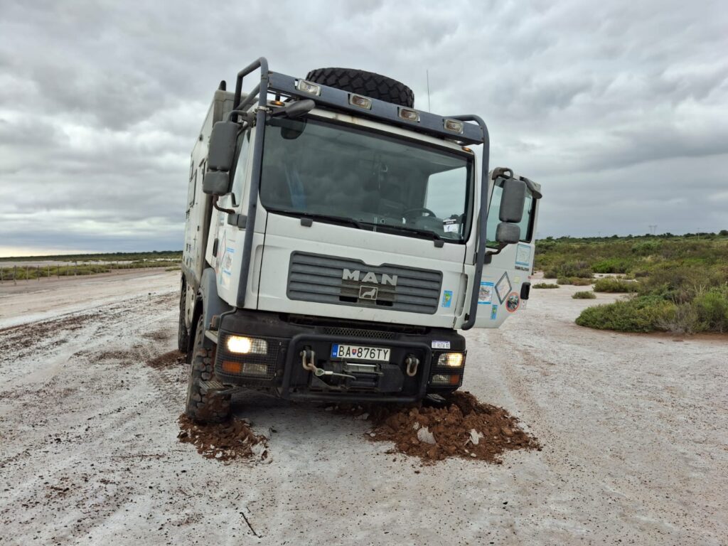 Dnes ďalej ku Cordobe, spanie sme vyhliadli pri Lucio V.Mansilla, hneď vedľa salín. Všetko bolo OK, cesta na flek suchá, tak že to zabodneme, odbočil som trochu z cesty a zrazu sa predné koleso ponára. Vyzeralo to suché, ale saliny sú zradné, pod tvrdou krustou je blato.